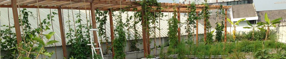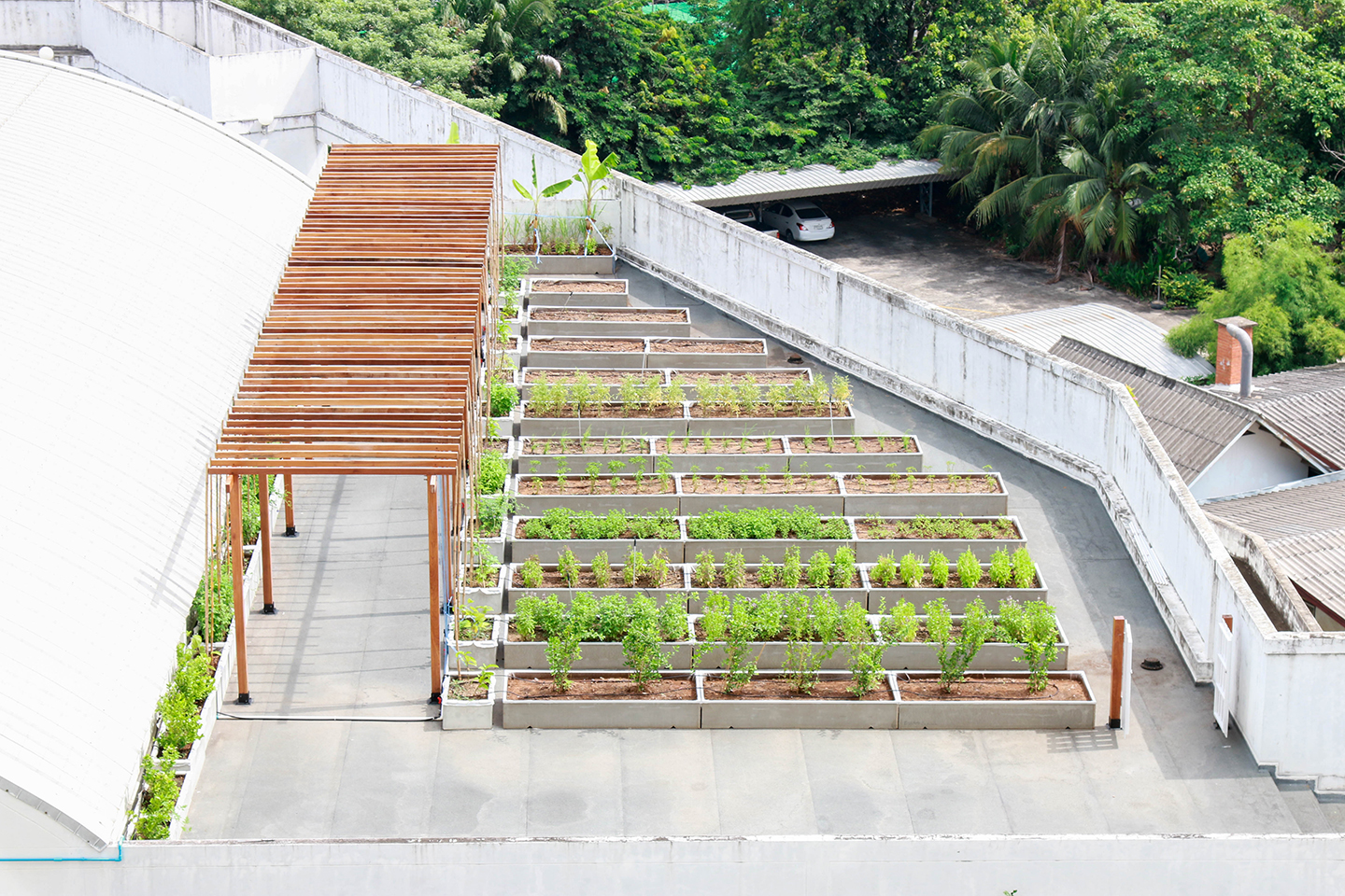 Financé par la Fondation Thaïlandaise pour la Promotion de la Santé, ce toit-potager de 200 m2 a été mis en place en 2012 suite aux inondations ayant frappé Bangkok. Initialement utilisé en tant que site-test des performances thermiques des toits et des jardins verticaux, quelques-uns des dispositifs expérimentaux, tels que les revêtements isolants de toiture écologiques, les façades bio-adaptatives et les potagers suspendus, furent alors installés sur le site.