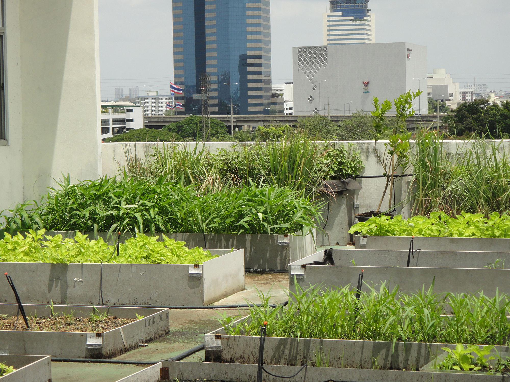 A Bangkok, le programme d’Agriculture Urbaine de l’Université Kasetsart (KU) englobe deux volets principaux: recherche et éducation. Une équipe d’enseignants en innovation du bâtiment et aménagement paysager de la Faculté d’Architecture a été le fer de lance d’une initiative de reconversion des toits inutilisés du campus en potagers de dispositifs hors-sol. Pour l’heure, le campus principal compte trois toits végétalisés.