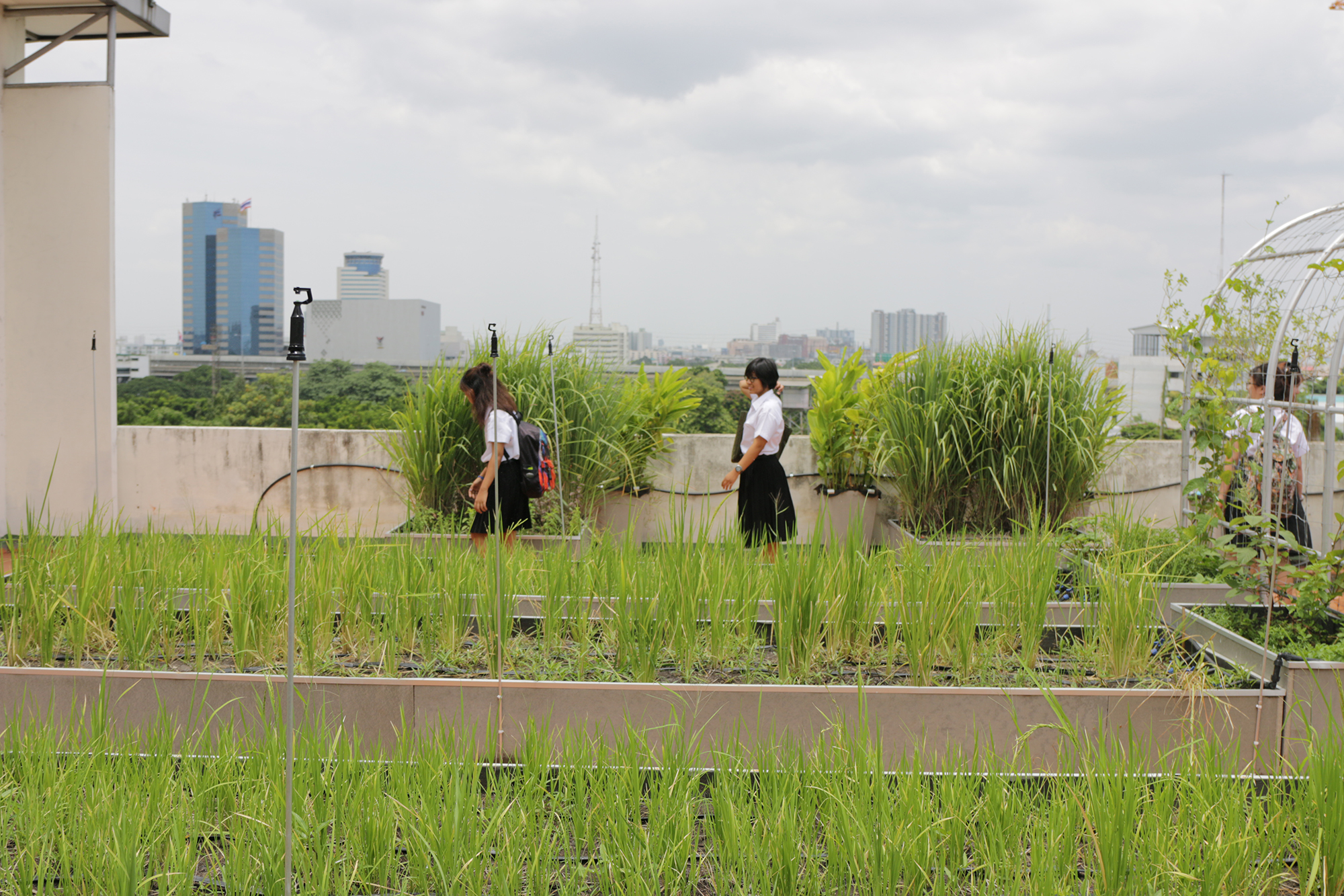 In Bangkok, the Urban Agriculture programme of Kasetsart University (KU) combines research and education. Spearheaded by a team from the building innovation and landscape design units at the Faculty of Architecture, this initiative has installed container-based gardens on several unused roofs across campus. Currently, gardens have been installed on three main campus roofs.