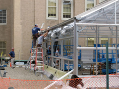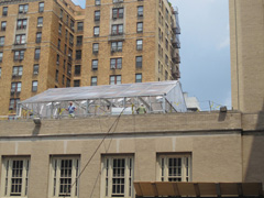 The first ideas for the rooftop - a low-budget concept for placing hundreds of plastic wading pools filled with dirt on the roof, followed by a plan involving more costly prefab planters – developed into a solution for a smaller deck based on the way that heavy equipment is typically supported on roofs. The final plan involves cutting through the roof slab and stubbing up columns from a hallway in the center of the school, placing on these two long steel beams as a foundation for a 20-foot-wide deck resting about four feet above the actual 60-foot-wide roof slab. That means the weight of the new rooftop deck will be distributed across the existing building columns, incorporating systems to address the safety and egress requirements associated with school use, developing forms and details to minimize the impact on existing systems. The challenge was especially associated with placement of an intensive green roof on an older building structure while complying with New York City’s School Construction Authority.