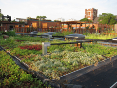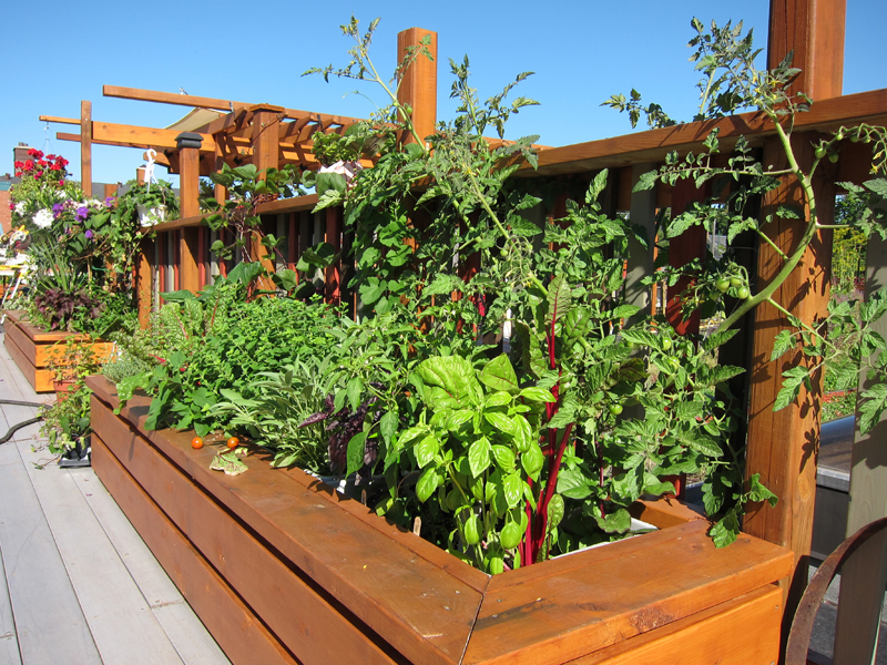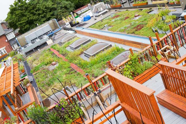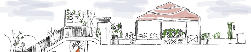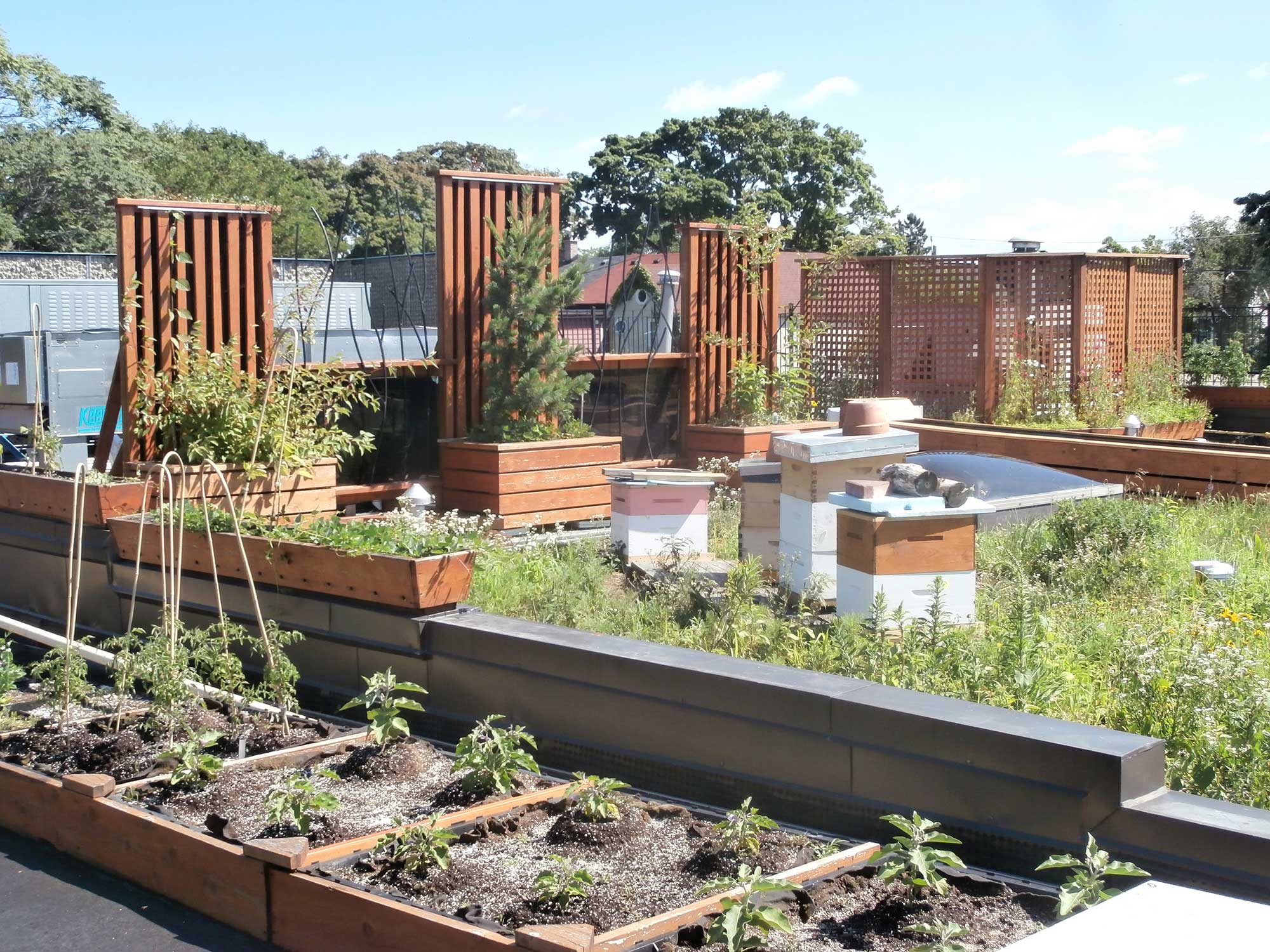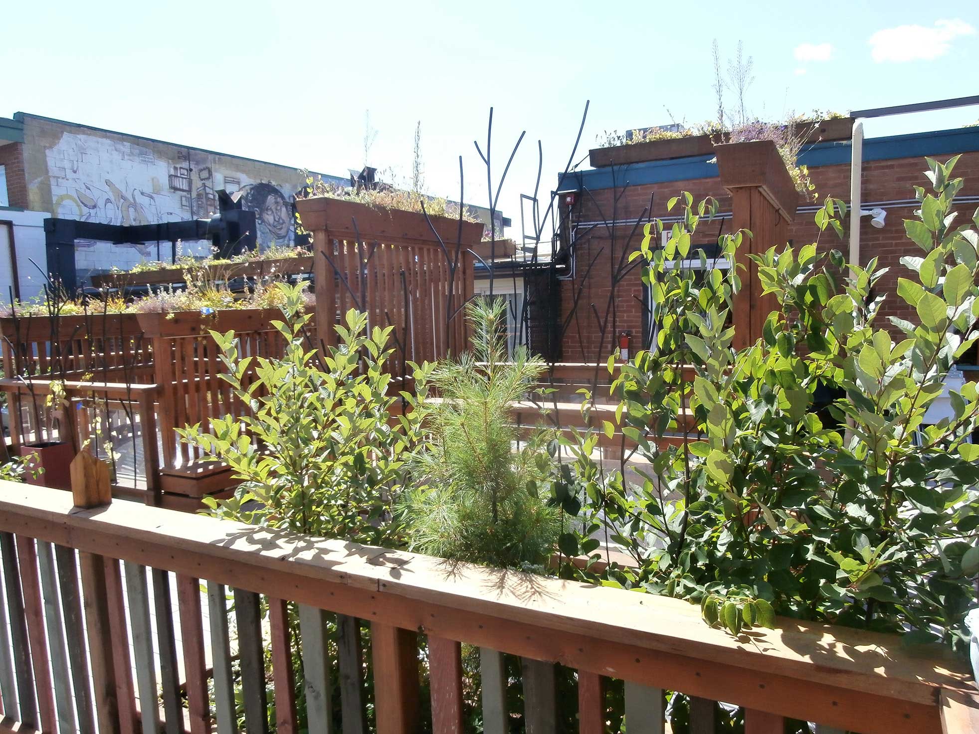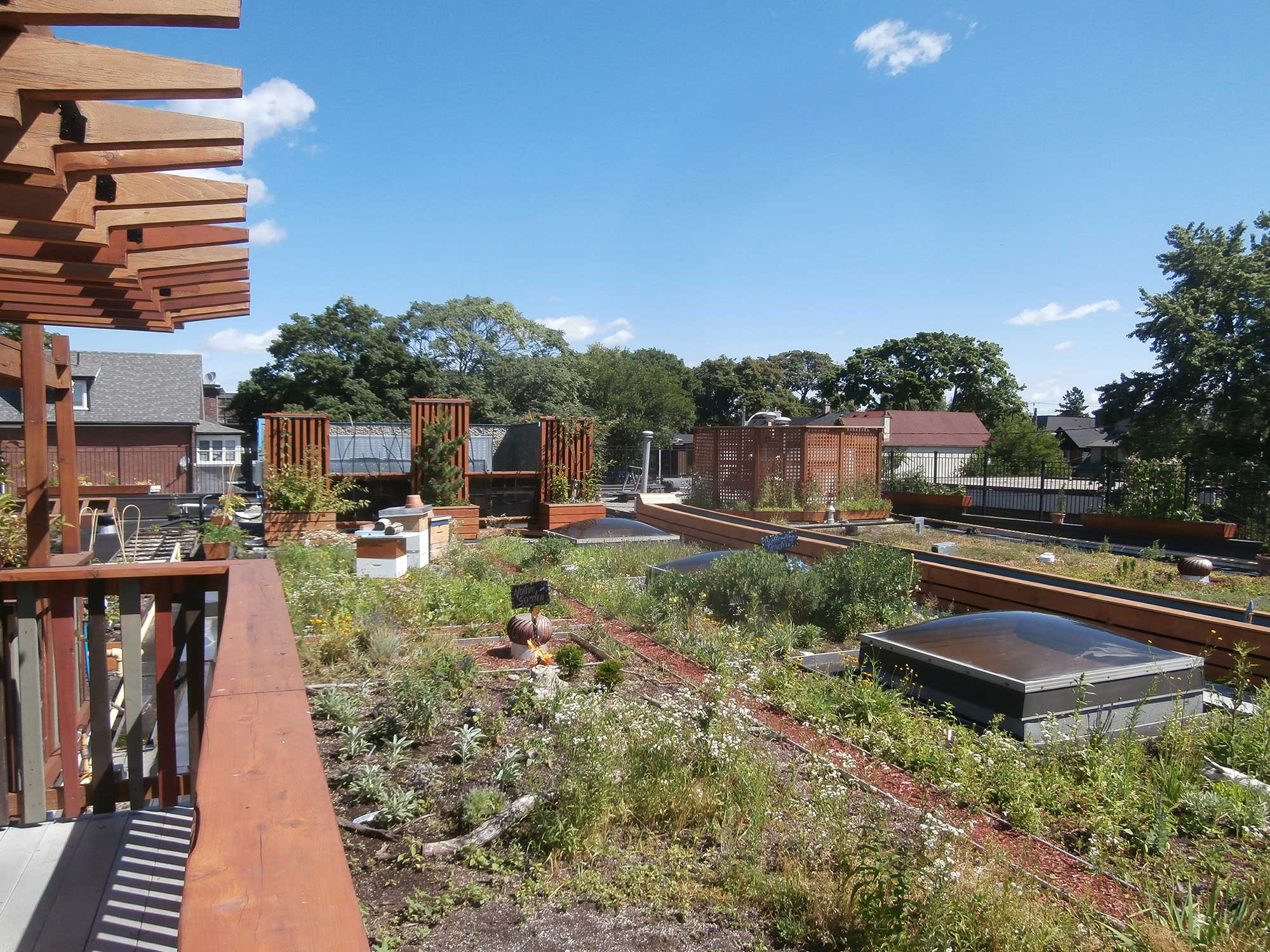 Carrot Common is a small urban complex of 17 retail and dining establishments, office space and meeting rooms in the heart of Toronto’s Greektown. With the Big Carrot Natural Food Market – a worker-owned co-operative grocery store – acting as anchor, CC is a two-storey building topped with a roof garden and urban agriculture space called the Carrot Green Roof. The CC rooftop served as a restaurant patio from 1989 to 1996. However, in 1996, a design charrette to create a roof garden resulted in the transformation of the roof into a green oasis, with deck areas and diverse plantings.