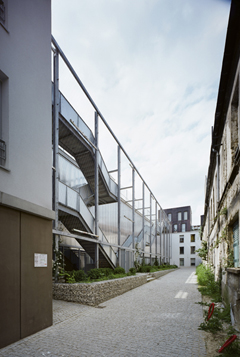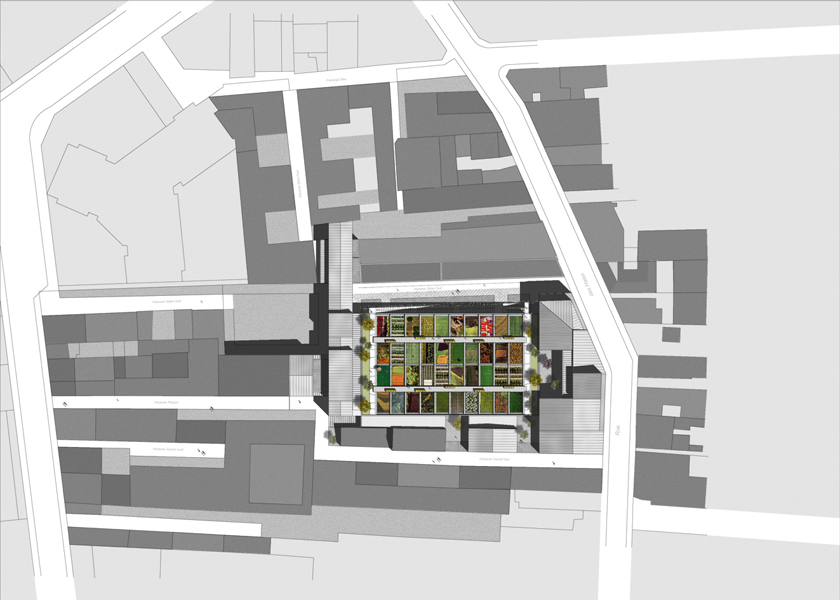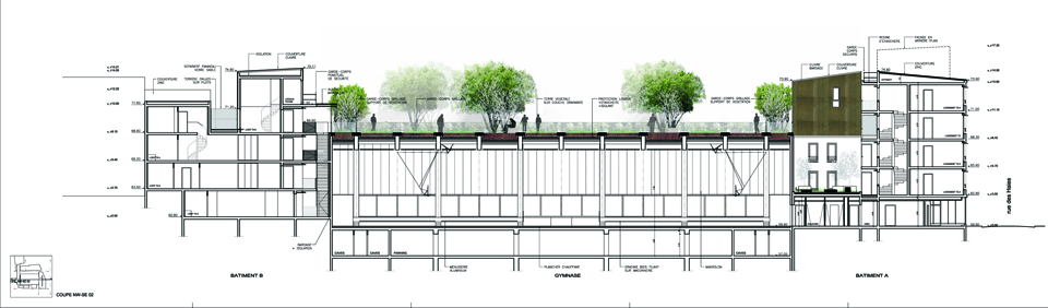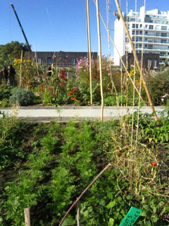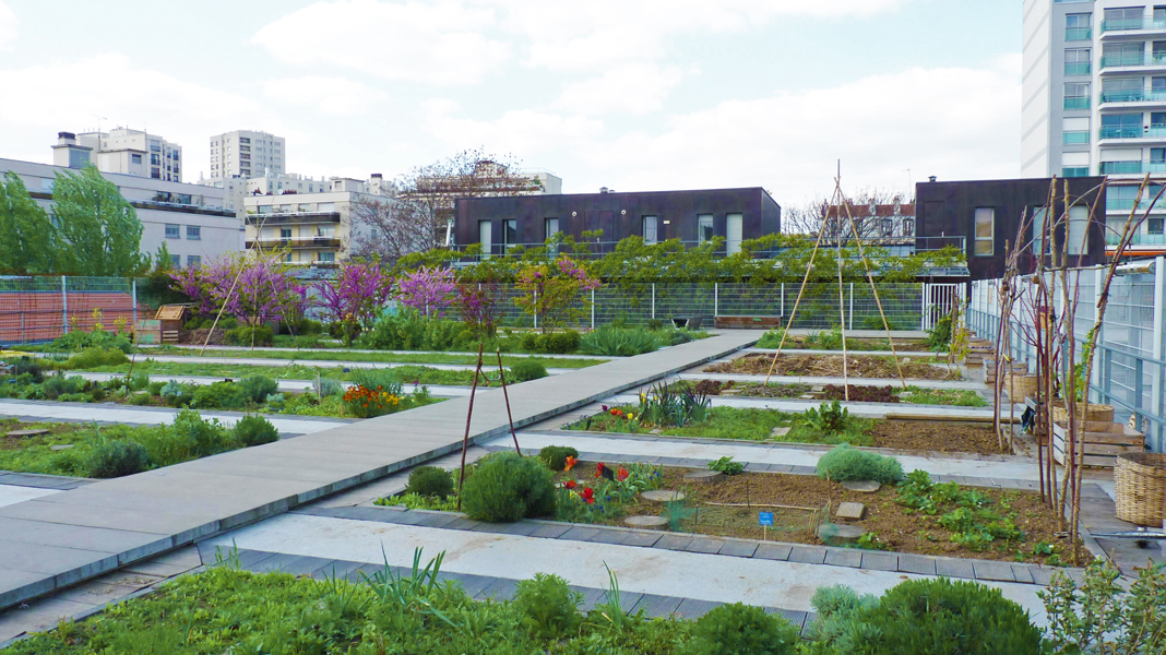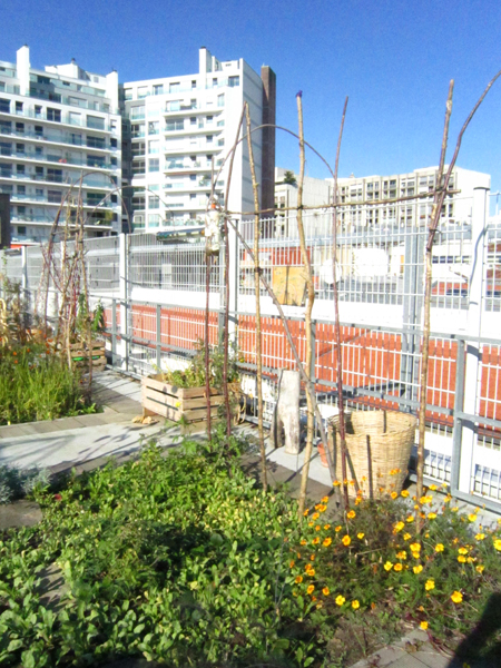 In the 20th Arrondissement of Paris a community garden of about 800 m2 has been constructed on the rooftop of the Gymnase Vignoles. The project was envisioned as a “hanging garden” on top of the new building, which also includes housing.
