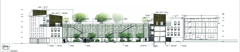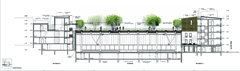 The roof structure of the gymnasium consists of prestressed concrete beams, which support rectangular wooden containers, filled with 30 cm deep soil. Auxiliary spaces and storage are located at the edge of the garden.