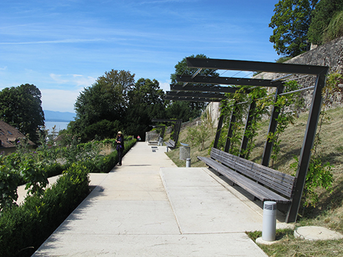 Since the 1980s, the small Swiss town of Nyon had wanted an underground parking garage. In 2004 a city-sponsored competition was launched to design this park on top of a new parking garage for a sloping site at the edge of Lake Geneva. The landscape architect Ruth Vorlet, teamed with Paola Alfani, won the competition. The accessible design features both an elevator from the garage to the highest portion of the park and a switchback pedestrian ramp that runs throughout the sloping site. The park provides a spectacular view of Lake Geneva below, creating a visual link between the historic town and the lake.