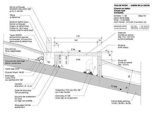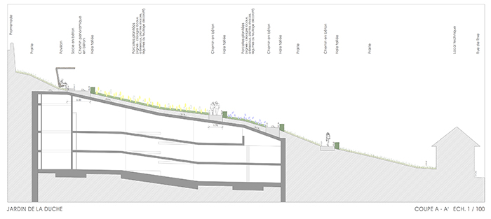 Depuis les années 1980, la petite ville Suisse de Nyon possédait un parc de stationnement souterrain. En 2004, un concours parrainé par la ville a été lancé pour la conception d’un espace vert au-dessus d’un nouveau parc de stationnement sur un site en pente, au bord du lac de Genève. L’architecte paysagiste Ruth Vorlet, associée à Paola Alfani, a été la lauréate du concours. Du point de vue de l’accès, le projet comprend à la fois un ascenseur reliant le garage à la partie la plus élevée de l’espace paysager et un chemin piétonnier en zig-zag qui traverse le site en pente. Le Jardin de la Duche offre une vue imprenable sur le lac de Genève en contrebas, créant ainsi un lien visuel entre la ville historique et le lac.