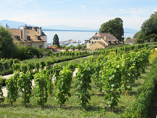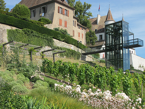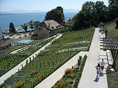 Provinyon vineyards provided a sample of local varietal grapevines for the site. Forty-seven rows of grapevines evoke the landscape of a vineyard, and also represent the forty-seven municipalities (communes) that are combined into the district of Nyon. The edible landscaping also includes fruit trees, bushes and other plantings that would be common in a kitchen garden. These aid in preventing soil erosion while highlighting the historical use of this land as a community garden and, before that, an orchard.