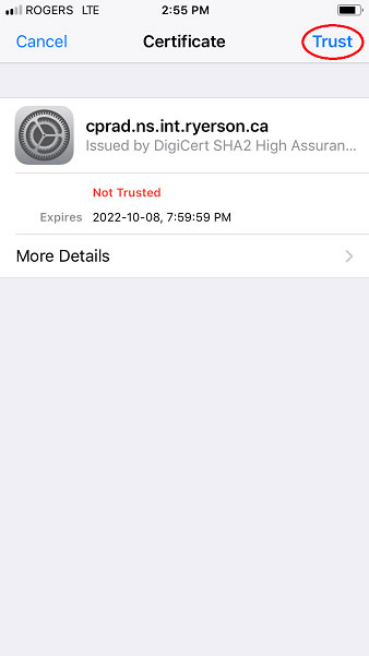 A screen will display asking you to accept a certificate. Select Trust. You may have to wait a few moments for the certificate to be processed.
