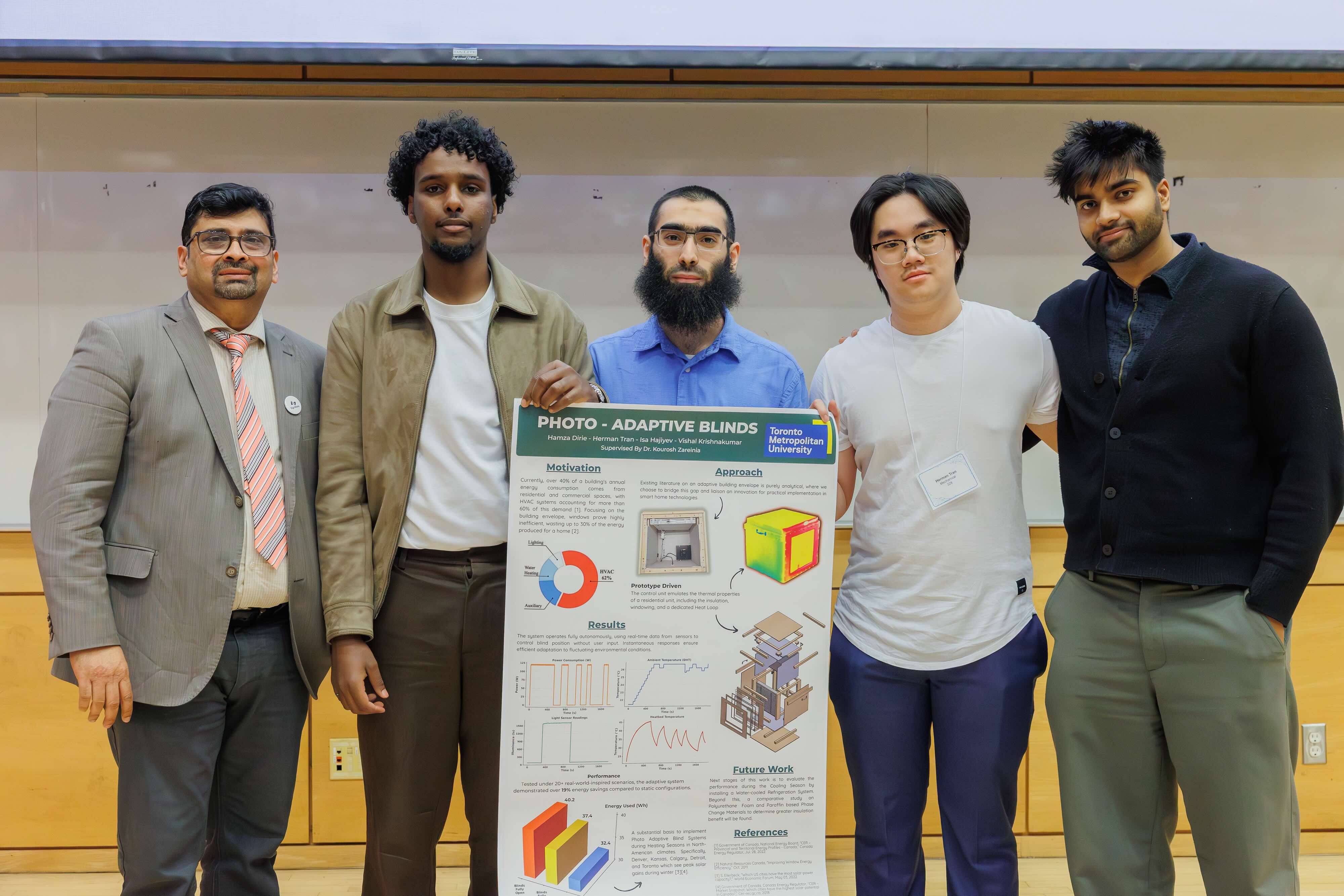 The Mechatronics Engineering team introduced the idea of Photo-Adaptive Blinds, a smart window covering that automatically adjusts based on the external brightness and temperature inside a room. Designed for places with variable seasonal changes like Toronto, it opens to let in natural warmth during cold weather and closes to block extra heat depending on the optimal control effort to reduce the current HVAC load.