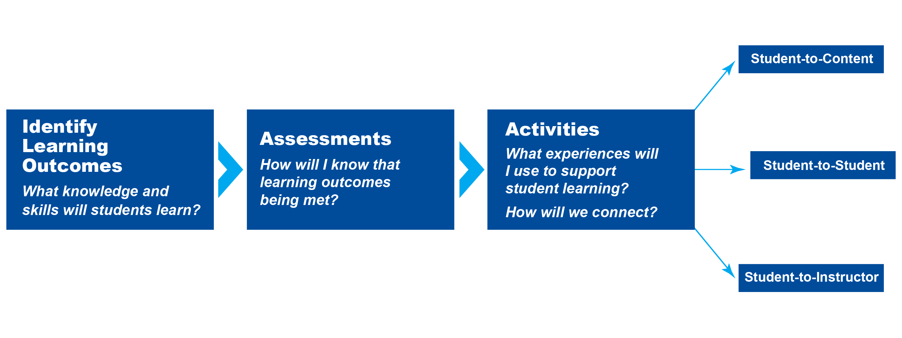 Lastly, identify what activities you will facilitate to support student learning; these activities can be through student-to-content, student-to-student, and student-to-instructor interaction (part of steps 3 to 5 in this process).