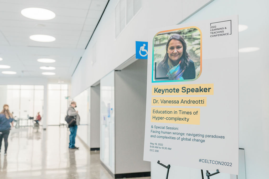 Dr. Vanessa Andreotti provided the keynote address with an overview of her work Gesturing Towards Decolonial Futures Art/Research Collective (GTDF) (external link) of which she is a founding member, based at UBC. She showcased educational tools that build our collective capacity and stamina to hold space for difficult conversations about wicked social and global challenges without feeling immobilized or demanding immediate quick fixes. Wicked challenges are characterized by hyper-complexity, uncertainty and interlocked problems with no possibility for easy solutions.