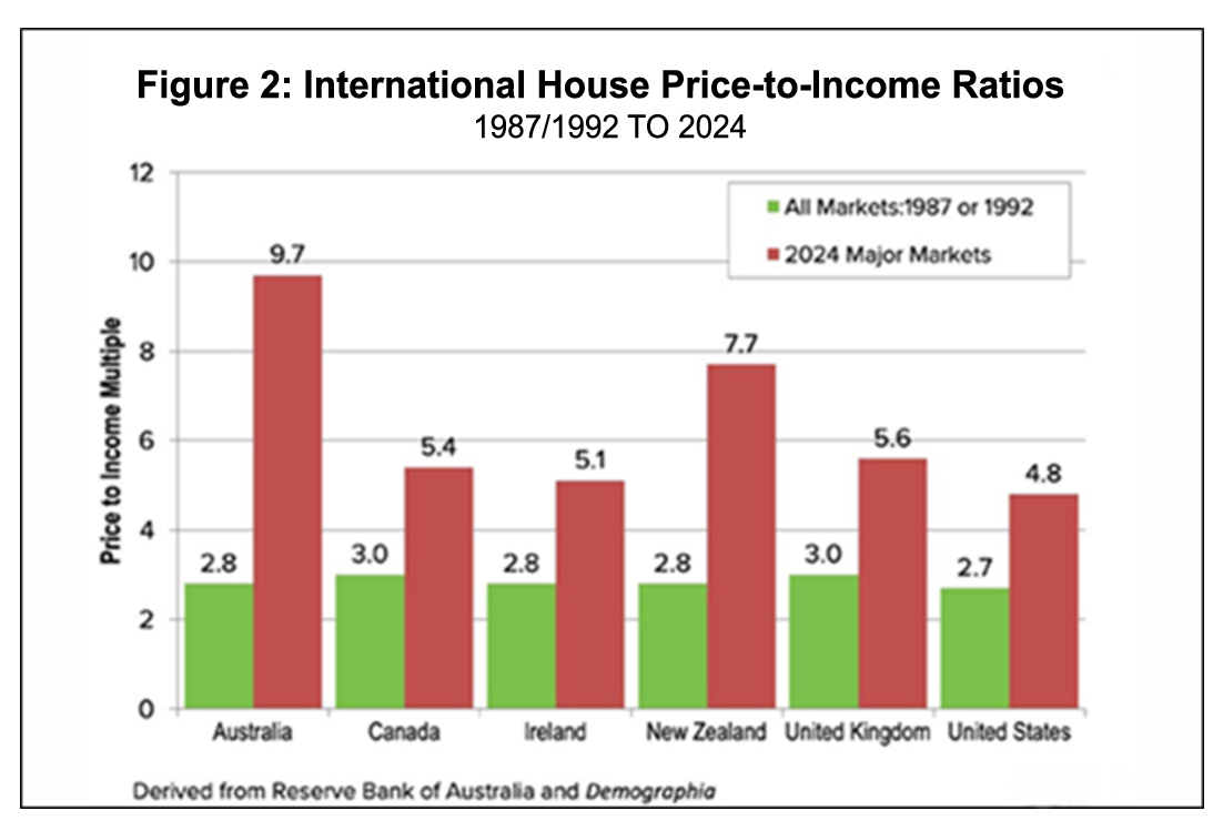 Based on Figure 2, housing was ‘affordable’ in all six countries examined in the late 1980s or early 1990s (meaning a house price/income ratio of three or under). Canada’s affordability ratio was 3.0. By 2024, however, housing was unaffordable in all countries, especially in Australia (9.7) and New Zealand (7.7), where housing is now considered ‘severely unaffordable’ or ‘impossibly unaffordable’. Canada’s affordability ratio of 5.4 is labelled ‘severely unaffordable’.