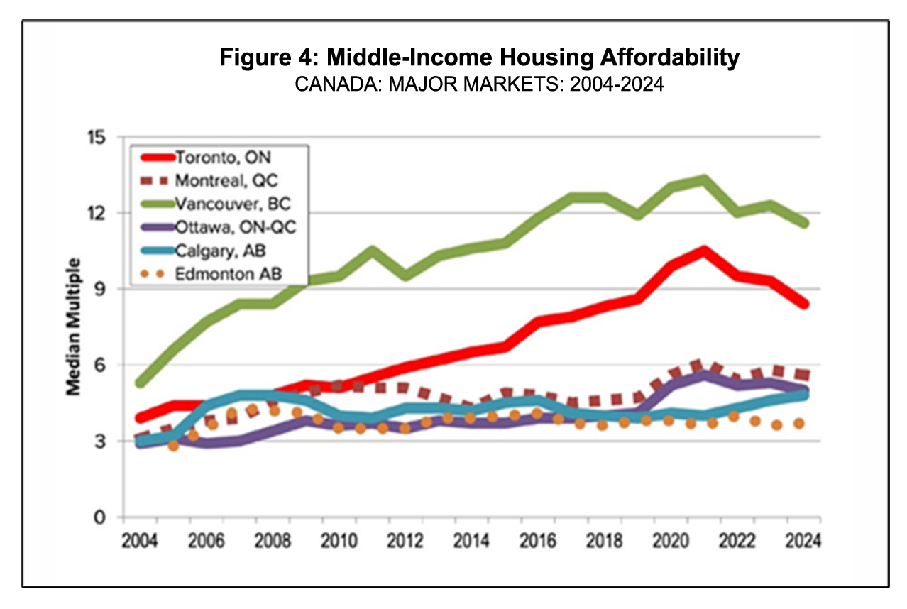 Within Canada, the decline in affordability since 2004 has been most severe in Vancouver and Toronto, with Edmonton recording little change