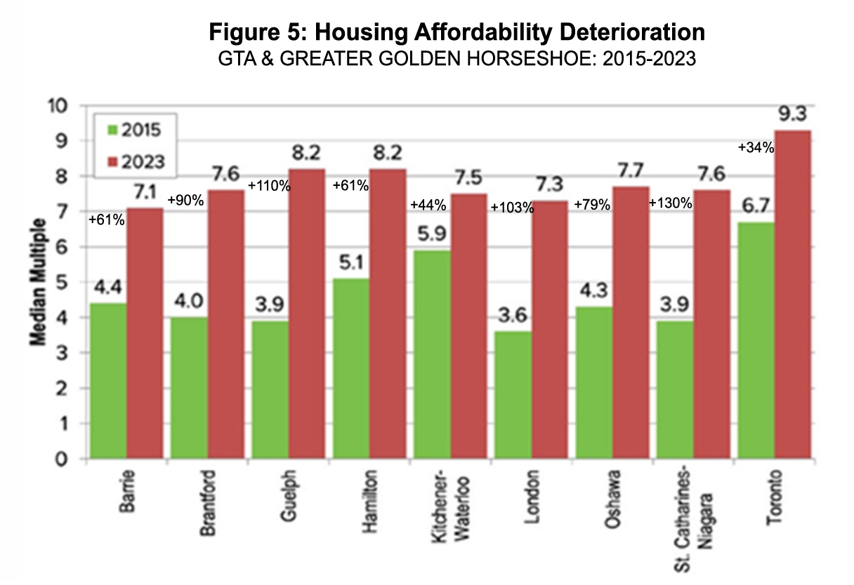 Affordability deteriorated the least in Toronto and Kitchener-Waterloo, and the most in St. Catharines-Niagara, Guelph and London within the Greater Golden Horseshoe (GGH) between 2015 and 2023