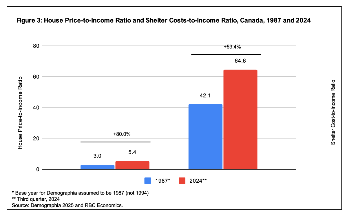 As Figure 3 shows, the affordability of house purchases declined significantly between 1987 and 2024 using RBC’s affordability measure – mortgage payments and other regular costs of homeownership associated with the purchase of an average-priced house as a proportion of median household income - though less so than with Demographia’s house price-to-household income estimates.[2]