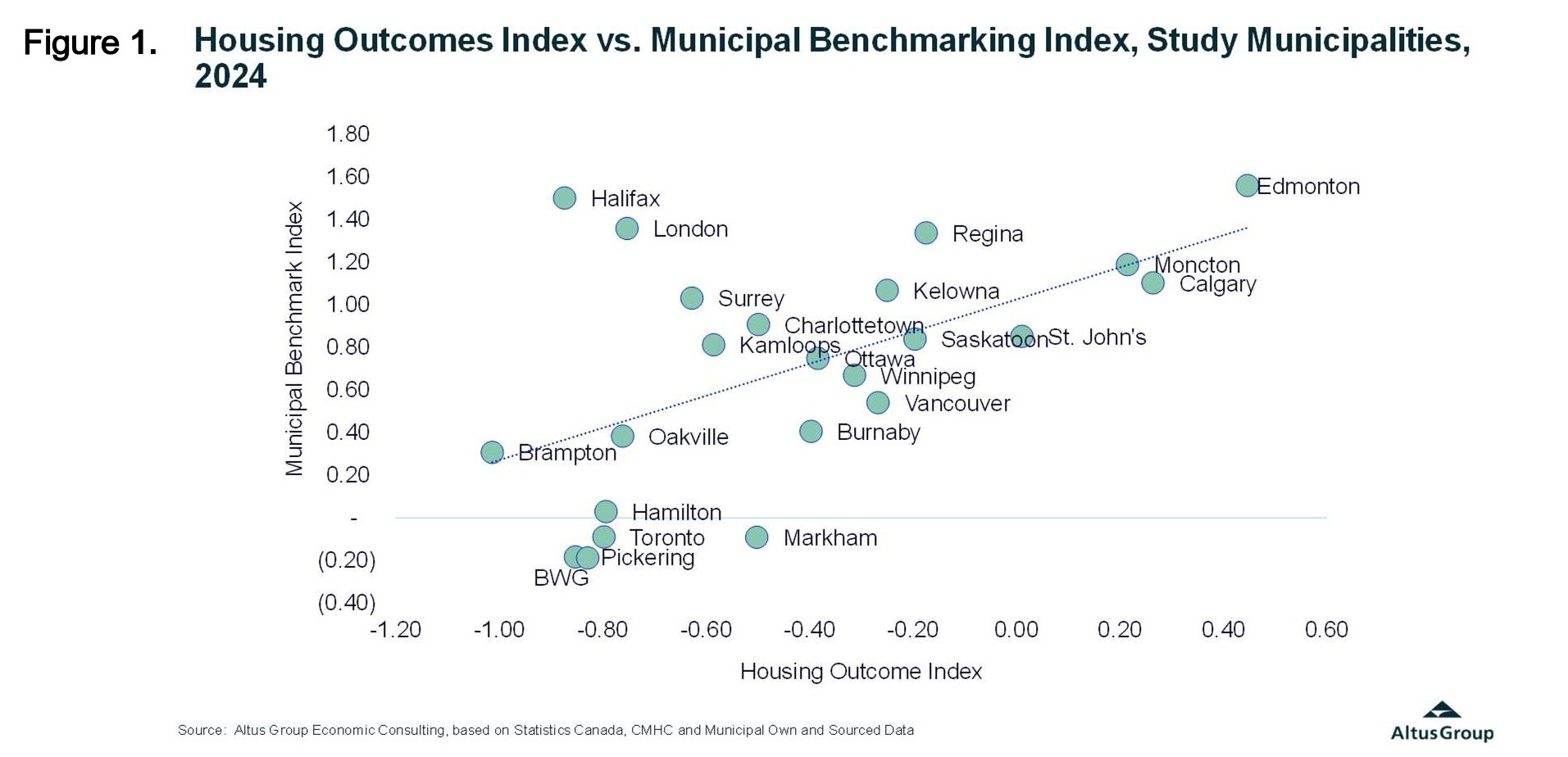 [6] Altus Group. “Municipal Benchmarking 2024 Study.” Prepared for the Canadian Home Builders’ Association. March 2025. The housing outcome index is based on four variables: housing affordability, suppressed households, rental vacancy rate, and out/in migration (p. 61). The municipal benchmarking index is based on three variables: approval timelines, municipal charges and fees levied on new residential development, and planning features used to facilitate more efficient and transparent development processes (p. 1).