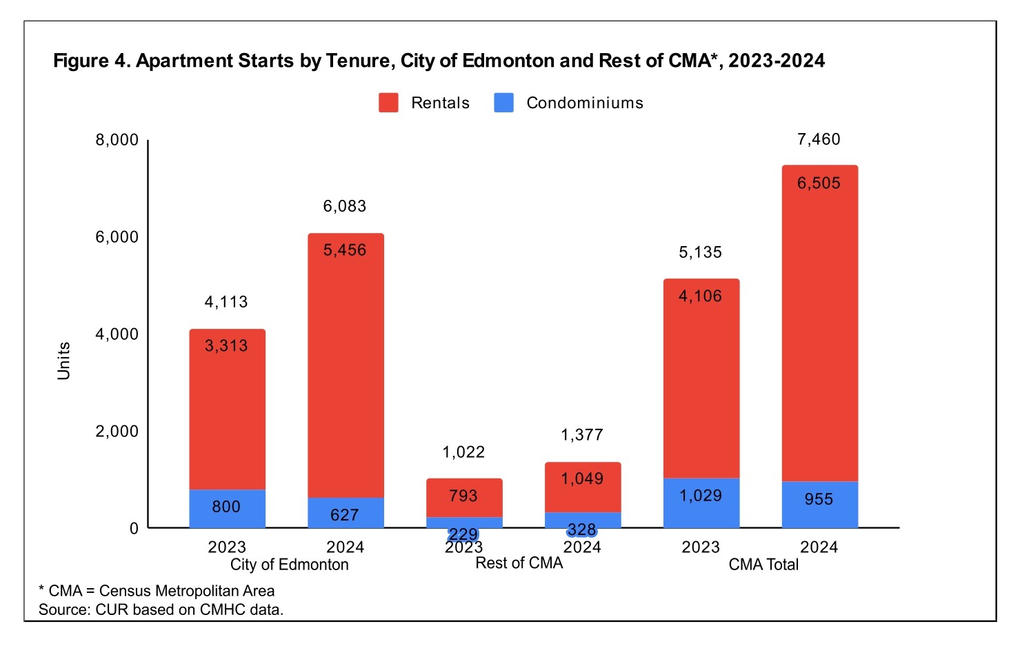 Figure 4 splits apartments starts in metro Edmonton between units intended for the rental market (purpose-built rentals) and those intended for the condominium market.[8]