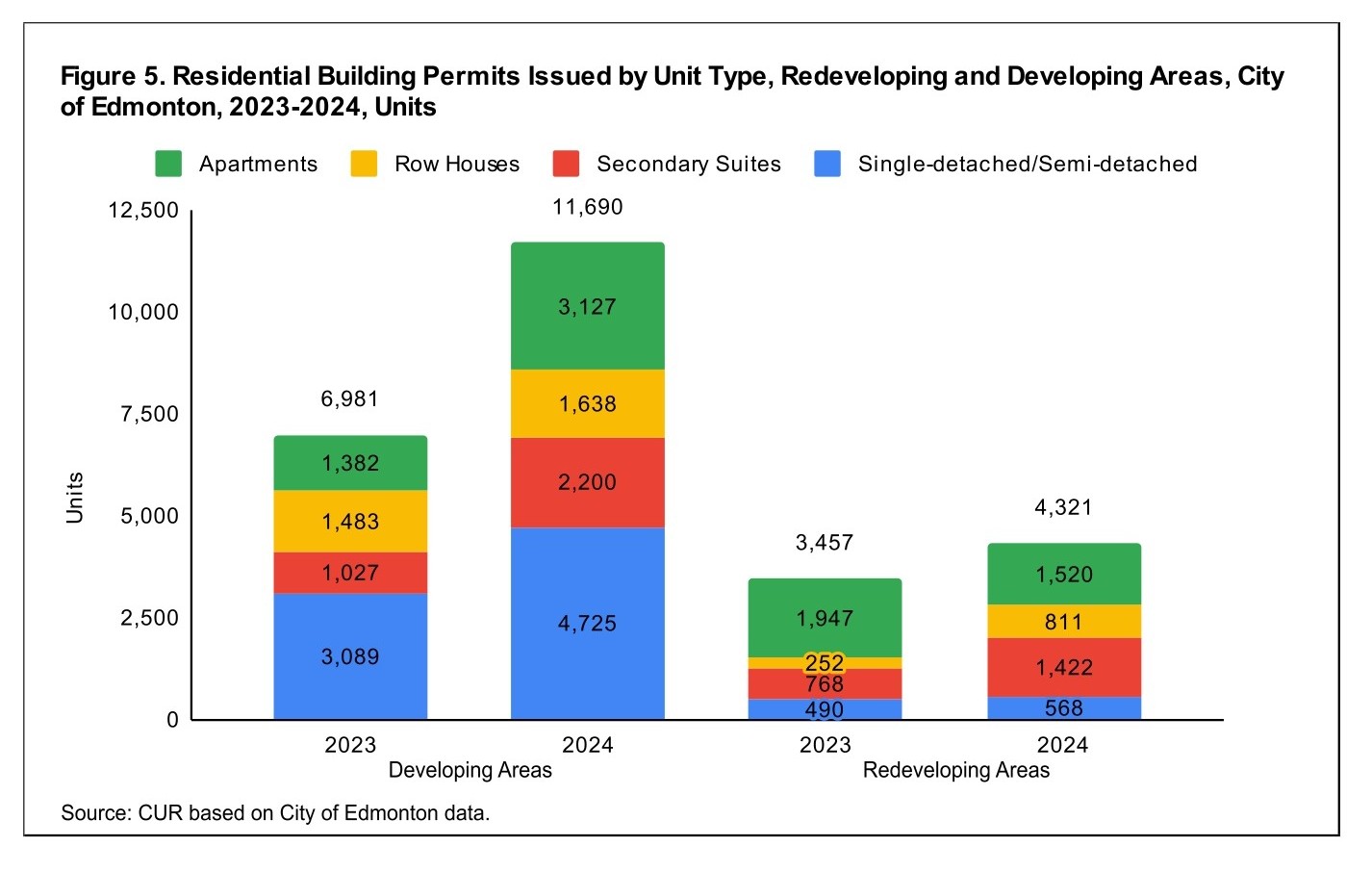 Figure 5 presents new housing building permits by type for greenfield areas (developing areas) and built-up areas (redeveloping areas) in the city of Edmonton in 2023 and 2024. Single- and semi-detached houses are combined. The city data separates secondary suites from other apartments.[9]