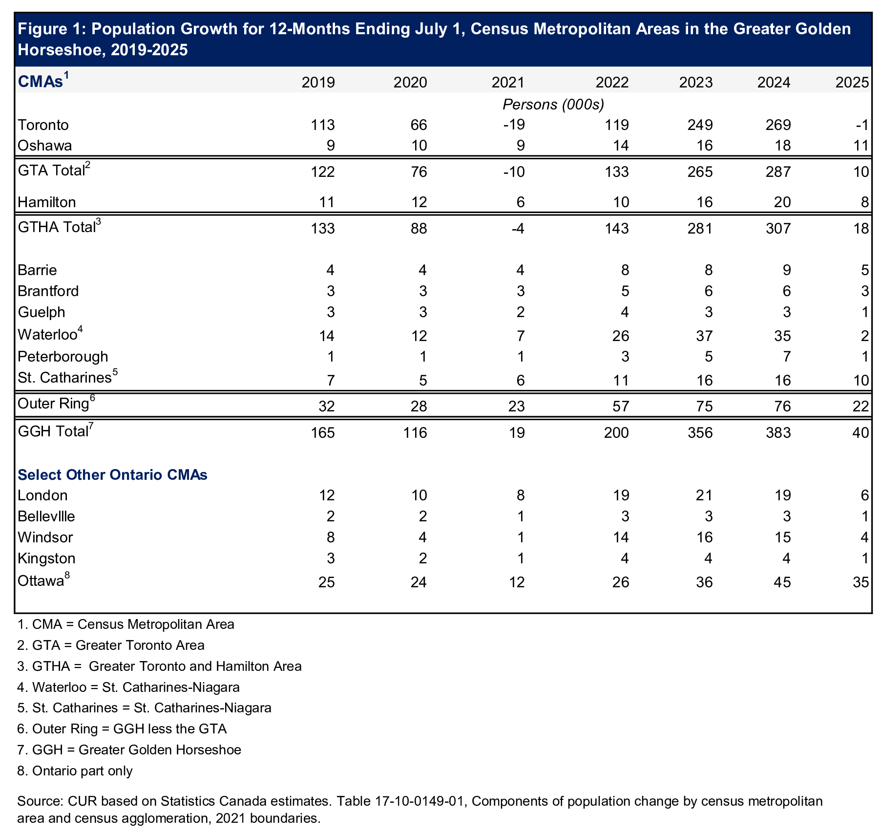 Figure 1 presents population growth for the 12 months ending July 1 from 2019 to 2025 for the nine CMAs within the GGH and for four other CMAs within Ontario.