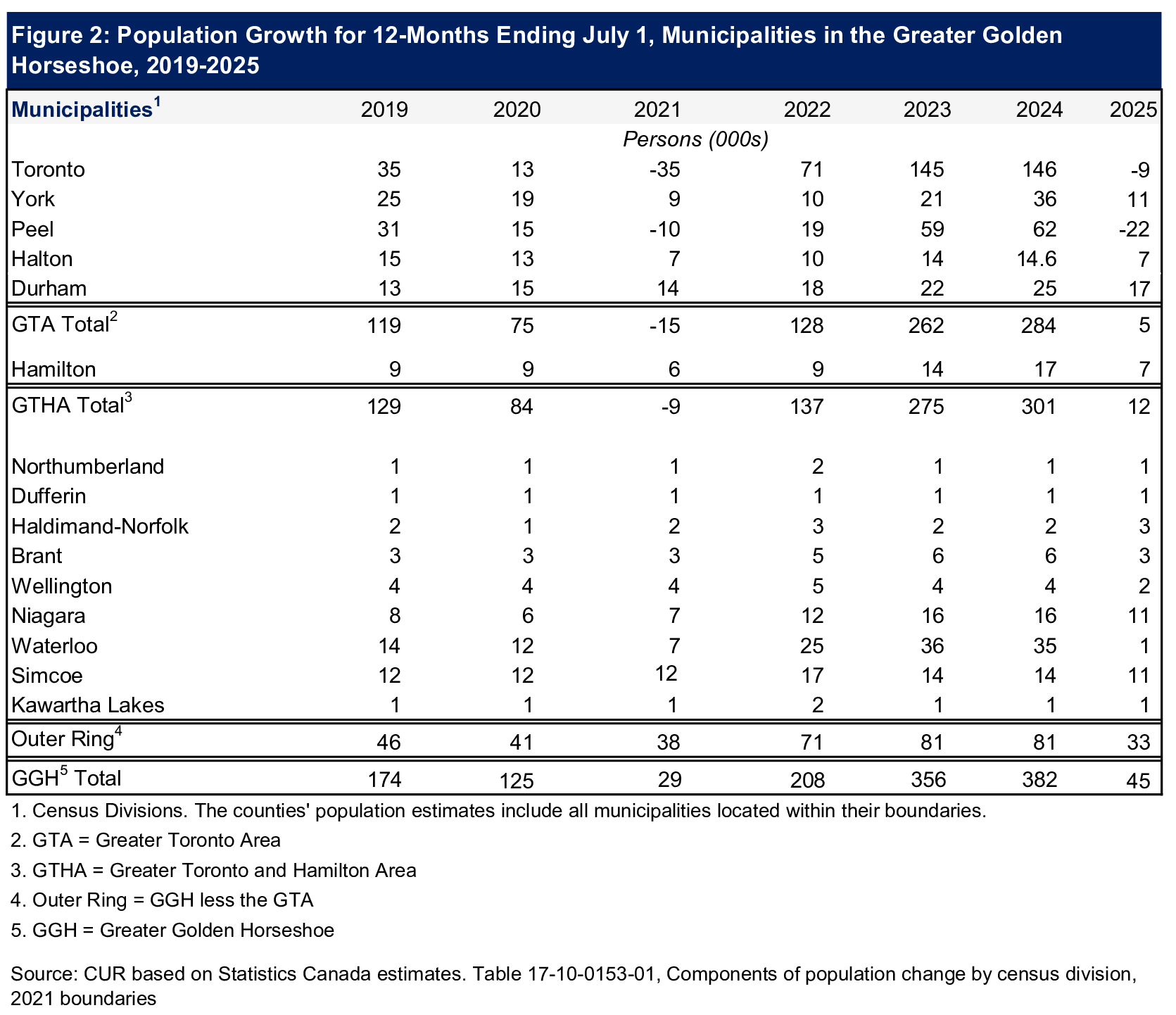 Figure 2 presents population growth for the 12 months ending July 1 from 2019 to 2025 for the major GGH municipalities as measured by census division boundaries (see footnote 1).