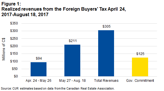 The Ontario government data shows that from April 24th, 2017 through August 18th, 2017, foreign buyers purchased 2,553 housing units across the GTA. Based on this we can estimate the NRST revenue received from the GTA in those months. If we assume they transacted at the average priced home, the total revenue would be $300 million for that four-month period alone (Figure 1). The caveat is that we don’t know how the data captures purchases from non-residents who are exempt from the tax, such as students and temporary workers.