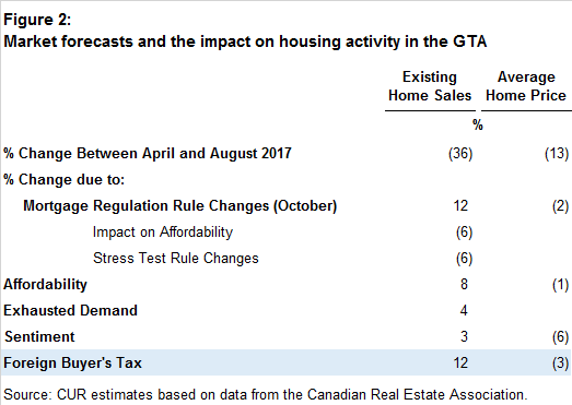 The foreign buyer’s tax has not been the sole driver of the 36% decline in housing sales and the $116,000 drop in average housing prices between April and August. The tax came at a time when a number of headwinds were building against housing demand in the GTA, the most impactful being (Figure 2):