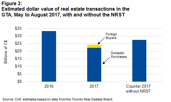 Once we strip away the impact of other market and economic forces, we estimate that the NRST only contributed to a third of the decline in existing home sales and a quarter of the decline in average home prices. Real estate transactions totalled roughly $24 billion across the Toronto Real Estate Board (not seasonally adjusted) between May and August. Based on our model estimates, total dollar sales would have been roughly $3.3 billion dollars (not seasonally adjusted) higher had the tax not happened. This implies the tax itself would have led to roughly $53 million in lost provincial revenues from the impact of the drop in sales on the domestic portion of the land transfer tax, at an effective rate of 1.6%.