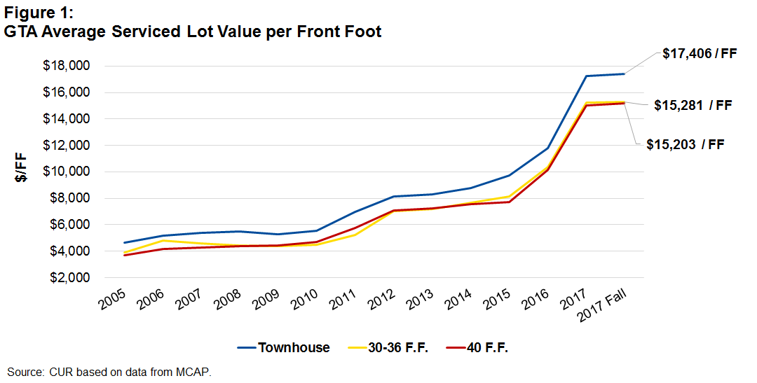 Serviced land values for single-detached and townhome developments in the Greater Golden Horseshoe (GGH) had been growing at a steady pace between 2005 and 2014 – but then exploded in 2015 (Figure 1). New data released by MCAP, one of Canada’s largest independent mortgage financing companies, shows that prices doubled between 2015 and the fall of 2017. The price of a 30 to 36 foot frontage went from just over $200,000 in early 2015 per foot frontage to roughly $600,000 in the fall of 2017 (Figure 1). These price pressures have also spread into the condo apartment market (once a beacon of stability), where land values have tripled over the same time frame in some areas across the region. The data can be found on the MCAP website at https://www.mcap.com/development-finance/land-value-report (external link) .