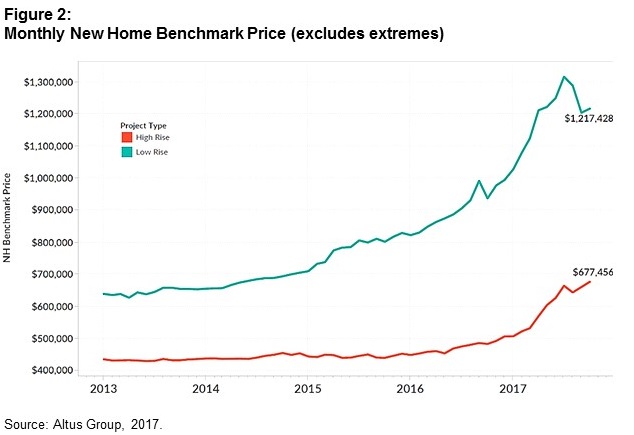 Mike Czestochowski kicked off the discussion highlighting the residual land value concept at play in the condo apartment market. He noted that in the 1990s a condo could be sold for $400 a square foot of living area, which meant that land would sell for $40 a square foot. Currently condo apartments are selling for around $1,000 a square foot and land is selling for for $100 per buildable square foot, moving Toronto prices in line with Vancouver pricing. Figure 2 highlights the surge in purchase price for new high-rise and new low-rise in the GTA.