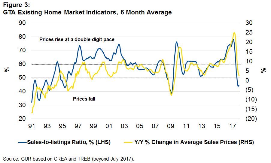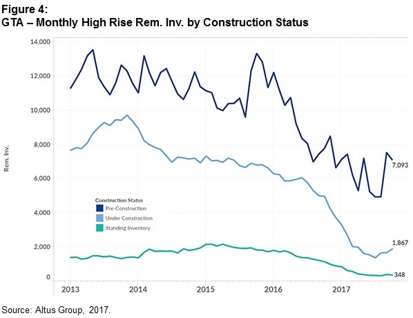 In the GTA, prices rise at a double-digit pace when this ratio rises above 60 and average prices fall when the ratio falls below 50. The ratio averaged 68 between January 2015 and early 2017, suggesting the bargaining power remained largely in the hands of the seller during this period. Mike pointed out that builders worked down remaining inventory very quickly, falling to decade lows (Figure 4). This even occurred in the condo market where standing inventory is currently sitting at 348 units, compared to a historically typical level of 1,500 to 2,000 units.