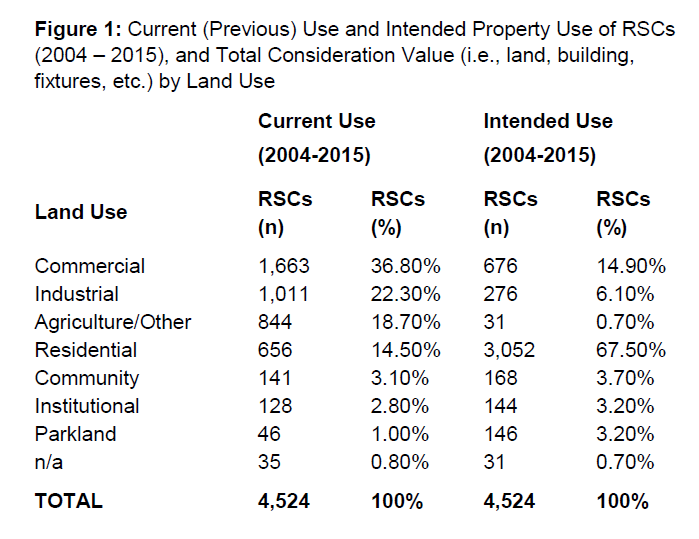 · RSCs filed in Toronto from 2004 to 2011 (n 1000) listed their current (previous) use as Commercial (46.9%), Industrial (25.0%), Residential (16.9%), Institutional (2.8%), Community (2.8%), Agricultural/Other (2.1%), and Parkland (1.4%) uses (2% n.a.), while their “intended” use was noted as Residential (66.2%), Commercial (12.1%), Community (6.8%), Parkland (4.8%), Industrial (4.3%), Institutional (3.7%), and Agricultural/Other (0.1%)(2% n.a.).