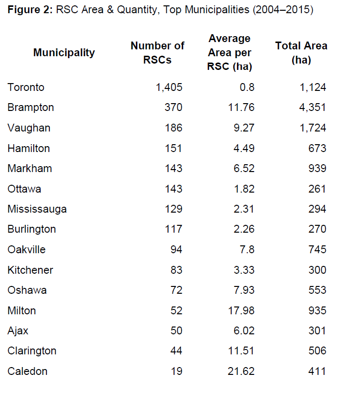 · While the city of Toronto filed more RSCs than any other municipality in Ontario (1,405 RSCs for 1,124 hectares, see Table 2), brownfields have also proven to be an important land resource for surrounding suburban municipalities where the total area reused is also high because the average site is larger (n.b., in some cases, as in Brampton, this is due to a greater share of filings being for larger former Agriculture/ Other sites.)