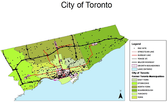 This study examined brownfield redevelopment activity in Toronto, Waterloo, and Kingston in greater detail using Records of Site Condition (RSC) filed between October 1, 2004 and June 30, 2011 and information about assessed value (land and buildings), building area, and tax class of property for 2013 from the Municipal Property Assessment Corporation. For Toronto, more detailed property information was gathered from public tax assessment terminals, property data maps, urban planning staff reports, market reports and development real estate websites to perform a more in-depth analysis of residential development. Also for Toronto, 2003 property tax assessments were gathered from the archives for a sample of 409 RSCs and compared with 2013 assessments to conduct a pre-post analysis of value increase.