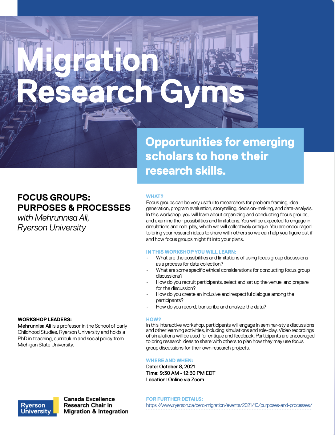 In this interactive workshop, participants will engage in seminar-style discussions and other learning activities, including simulations and role-play. Video recordings of simulations will be used for critique and feedback. Participants are encouraged to bring research ideas to share with others to plan how they may use focus group discussions for their own research projects.