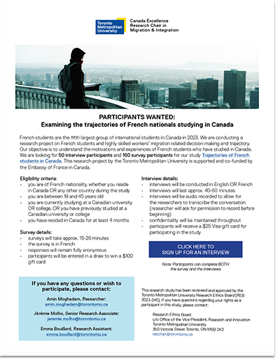 - An online survey of 160 French citizens aged 18-45, who are studying or have studied in Canada, will provide a quantitative understanding of their motivations and decisions.