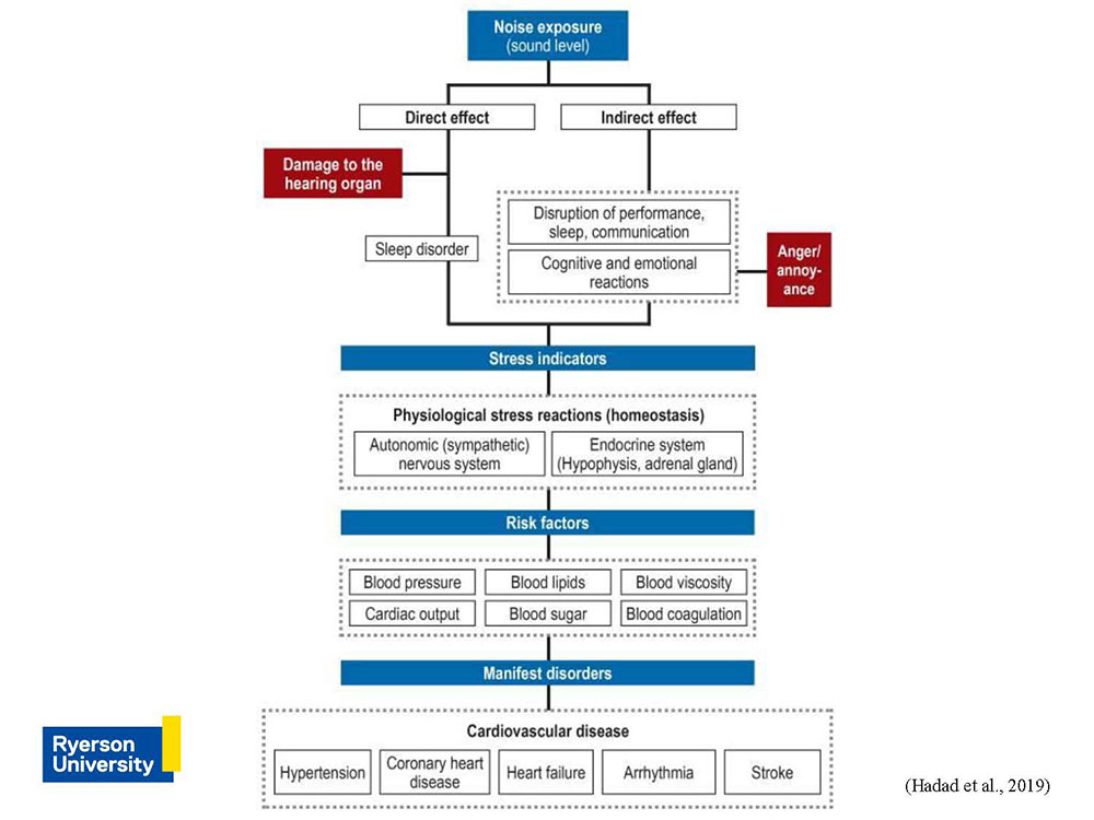 Dr. Oiamo utilized a visual to describe the direct and indirect effects of sound exposure. A direct effect, for example, could be physical damage to the hearing organ which could prompt sleep disorder. Indirect effects of sound exposure could include anger or annoyance, which may perhaps contribute to the disruption of performance, sleep and communication, as well as trigger cognitive and emotional reactions. Both the indirect and direct effects of sound exposure can lead to different biological and physiological responses that, over a period of time, can cascade and manifest as cardiovascular disease outcomes such as hypertension, coronary heart disease and heart failure.