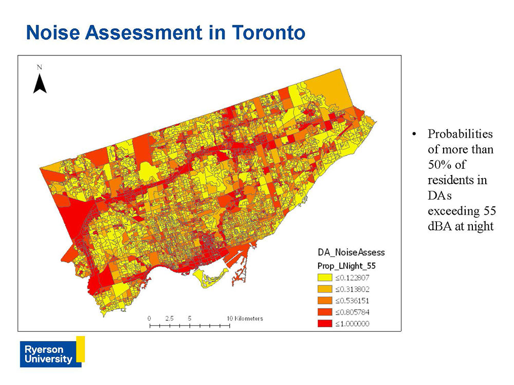 To complicate things further, not all noise is the same. Different sources of unwanted sound can have different health effects, which explains why it is important to know where sound is coming from. When sound is initially recorded, the health effects are unknown. Accordingly, Dr. Oiamo describes the detailed noise exposure map he created to estimate with more certainty traffic noise and total noise; he discovered that approximately 60 per cent of all noise variability in Toronto can be explained by traffic, depending on the time of day. Essentially, traffic is the most dominant and important source of noise in an urban environment.