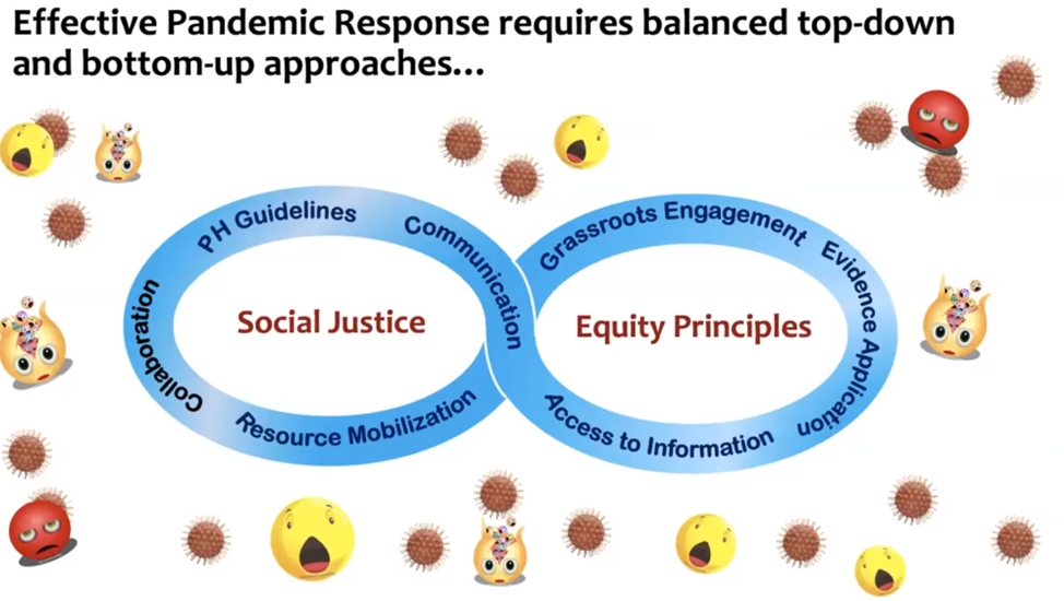 “COVID-19 has had lots of ‘shadow pandemics,’ …[notably those of] racism and mental health challenges,” says Dr. Wong, as she acknowledges that the pandemic has magnified structural violence that has existed for “hundreds of years.” She stresses the importance of balanced top-down and bottom-up approaches for effective pandemic response and uses the below diagram to illustrate the continuous connection among people.