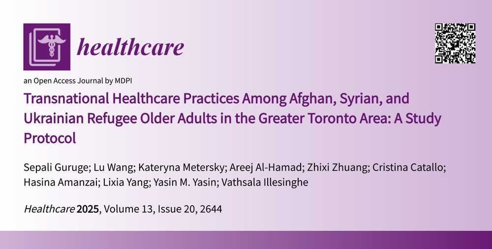 Guruge, S., Wang, L., Metersky, K., Al-Hamad, A., Zhuang, Z., Catallo, C., Amanzai, H., Yang, L., Yasin, Y. M., & Illesinghe, V. (2025). Transnational healthcare practices among Afghan, Syrian, and Ukrainian refugee older adults in the Greater Toronto Area: A study protocol. Healthcare, 13(20), 2644. https://doi.org/10.3390/healthcare13202644 (external link)