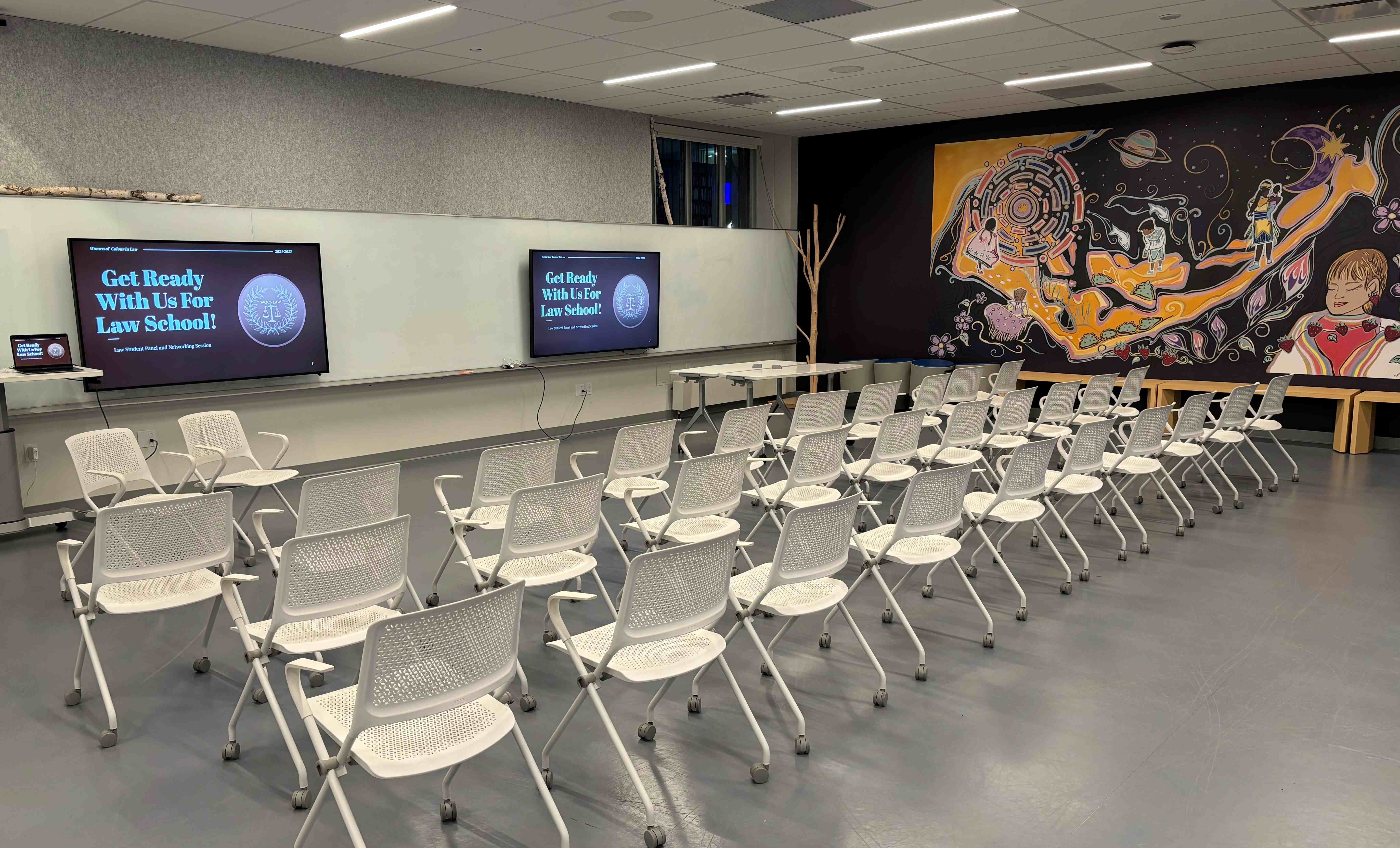 This mural by TMU alumnus and Indigenous artist Miranda Black incorporates Indigenous knowledges and teachings into the active learning classroom. The QR code to the right of the mural links instructors and students to additional information regarding the many different elements of the mural and commentary from artist Miranda Black, Director of Aboriginal Initiatives Monica McKay, and Elder & Senior Advisor Joanne Delaire.