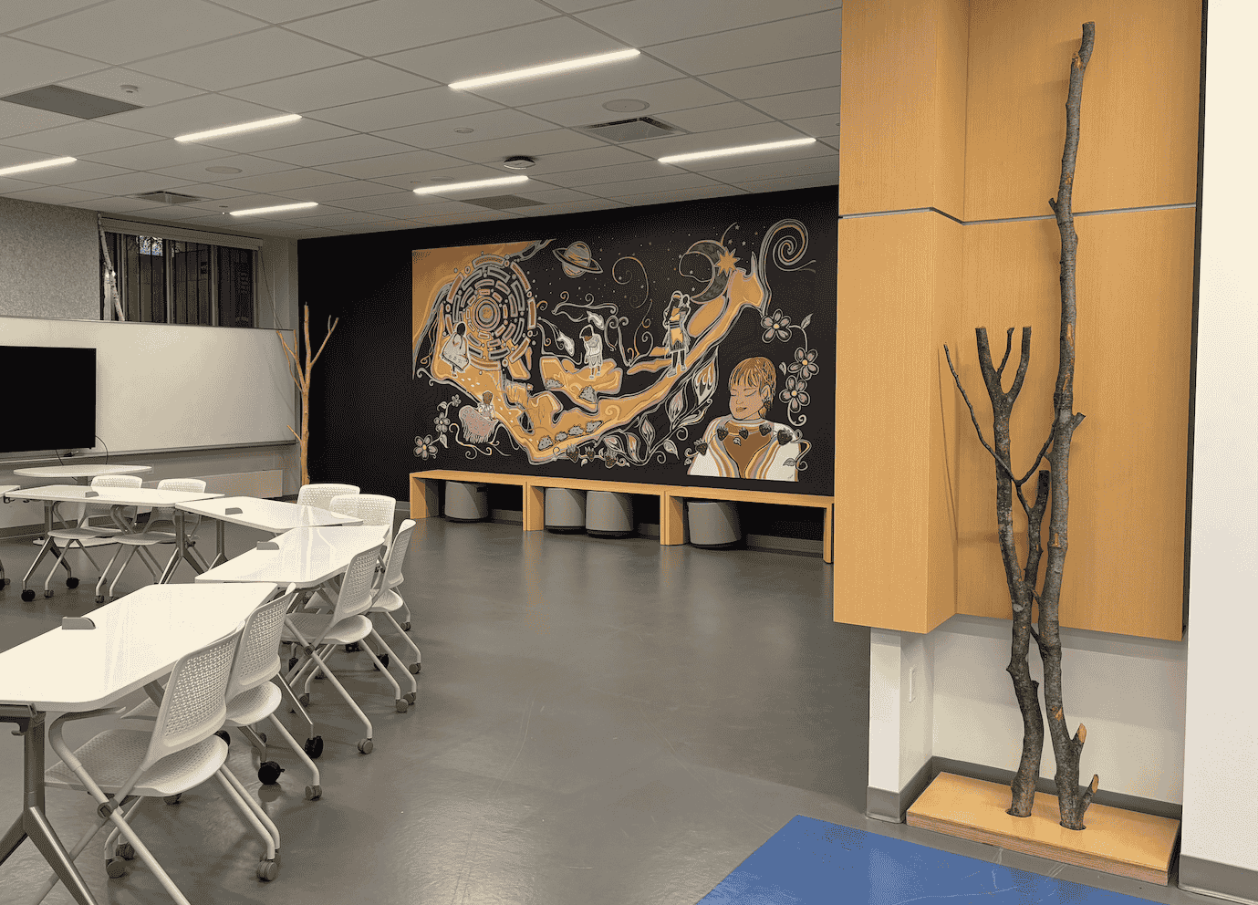 The Active Learning Classroom was designed to incorporate the learning space design values (opens in new window) developed by the Teaching and Learning Spaces Working Group and to reflect the Indigenous design principles identified through the (google doc) Indigenous Community Consultations (external link, opens in new window) . The classroom intentionally supports the wellbeing of all users through the use of design elements such as tunable white lighting, accessible furniture, and the incorporation of Indigenous art.
