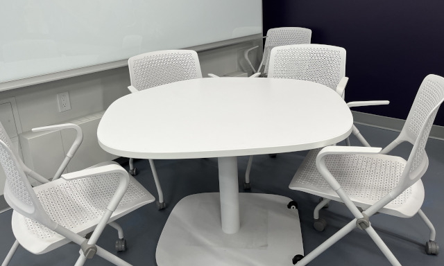 The Active Learning Classroom is designed to be a fully collaborative learning space. All of the moveable (wheeled) furniture can be used for collaborative purposes, but additional furniture described below encourages instructors and students to engage in collaborative activities.