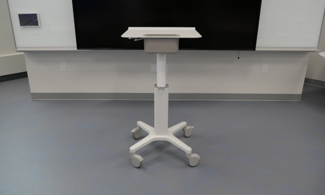 The instructor podium is height-adjustable and fully mobile, allowing instructors to teach from anywhere within the classroom.