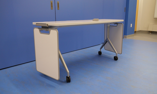 Moveable (wheeled) height-adjustable student table provides accomodation for students with seated or standing height preferences, and provides a large presentation surface for demonstrations.