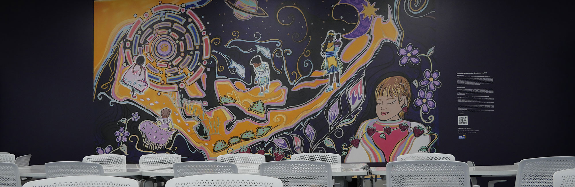 "Unfettered Access for Our Grandchildren," a piece by Miranda Black, TMU alumnus and Haudenosaunee visual artist, was chosen by a selection committee of Indigenous and non-Indigenous members of the TMU community as the feature wall art for the Kerr Hall West 57 Active Learning Classroom.