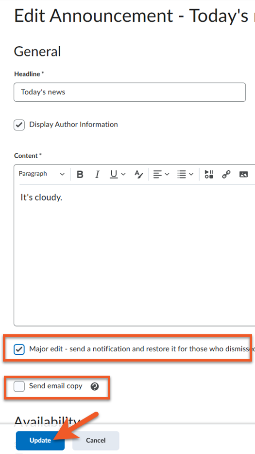 You can also select Send email copy if you want all users to receive an email copy of the updated announcement.