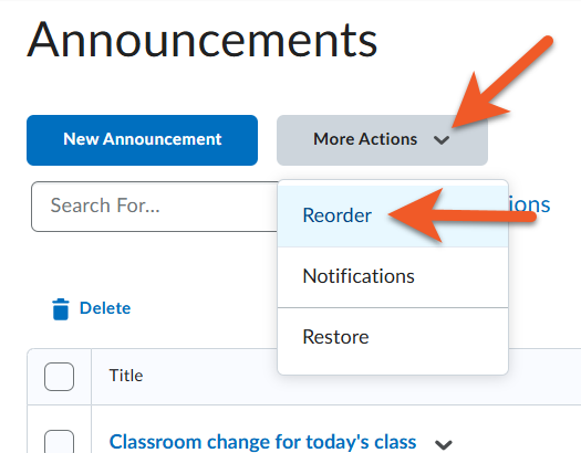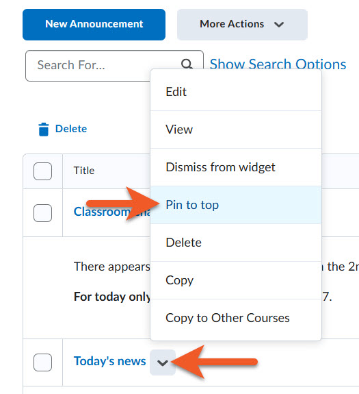 If you want an announcement to consistently appear at the list of announcements, you can do this from the main Announcements page.