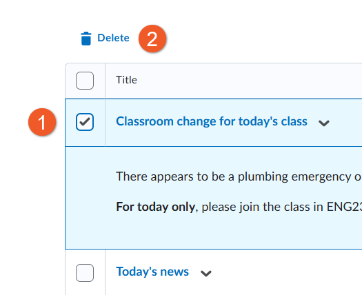 - From the Announcements page (Communication > Announcements), select the checkboxes to the left of the items to be deleted. You can select one or many items.