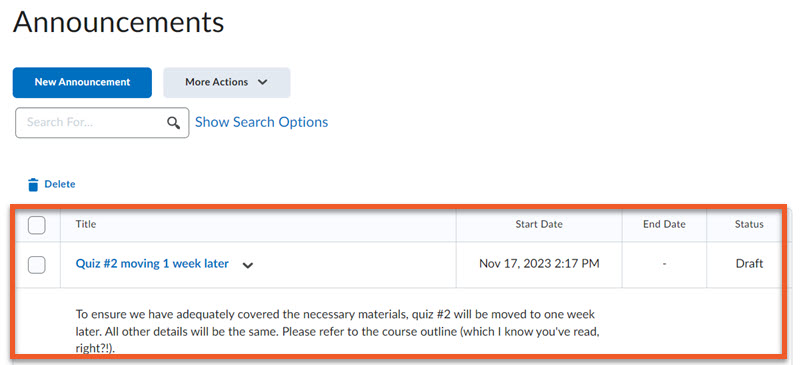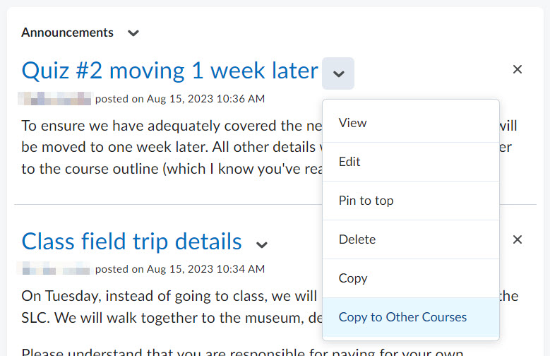 Please Note: Copied announcements are set to Draft status until you publish them, so that you have a chance to make any changes that may apply to that particular course section.