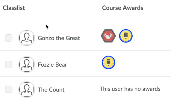 These awards can be given ad-hoc (manually), or automatically, using Release Conditions that issue awards based on course-related merit (completion of a task, grade achievement, etc.).