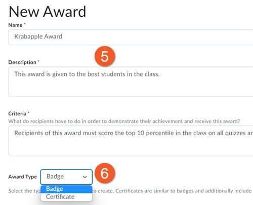 6. Select an Award Type - choose whether this award will be a badge or certificate.